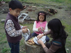 等火將土給燒紅了,木碳也夠多了,就將食材放至木碳中,再將燒紅的土塊覆蓋在食材上。